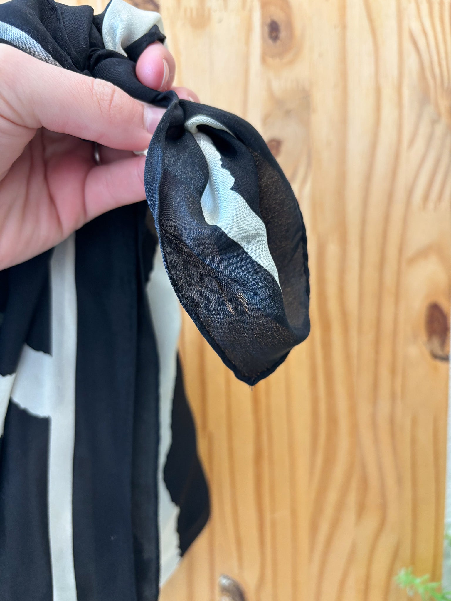 Has a couple stains throughout, but not noticeable when the scarf is tied!