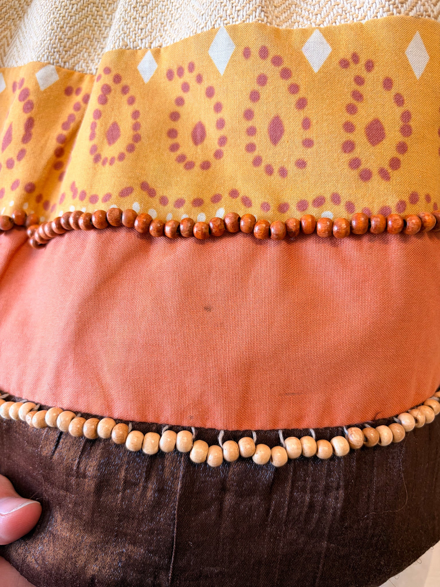 Has some faint spots on the outside as well as staining on the inner lining. There is also a spot that might be missing a couple beads, both shown in photos.