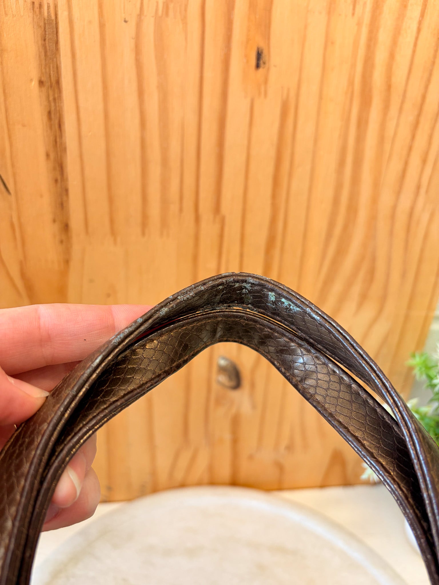 Has some staining on the outside, some wear on the handles, and inside has a loose lining. See photos.