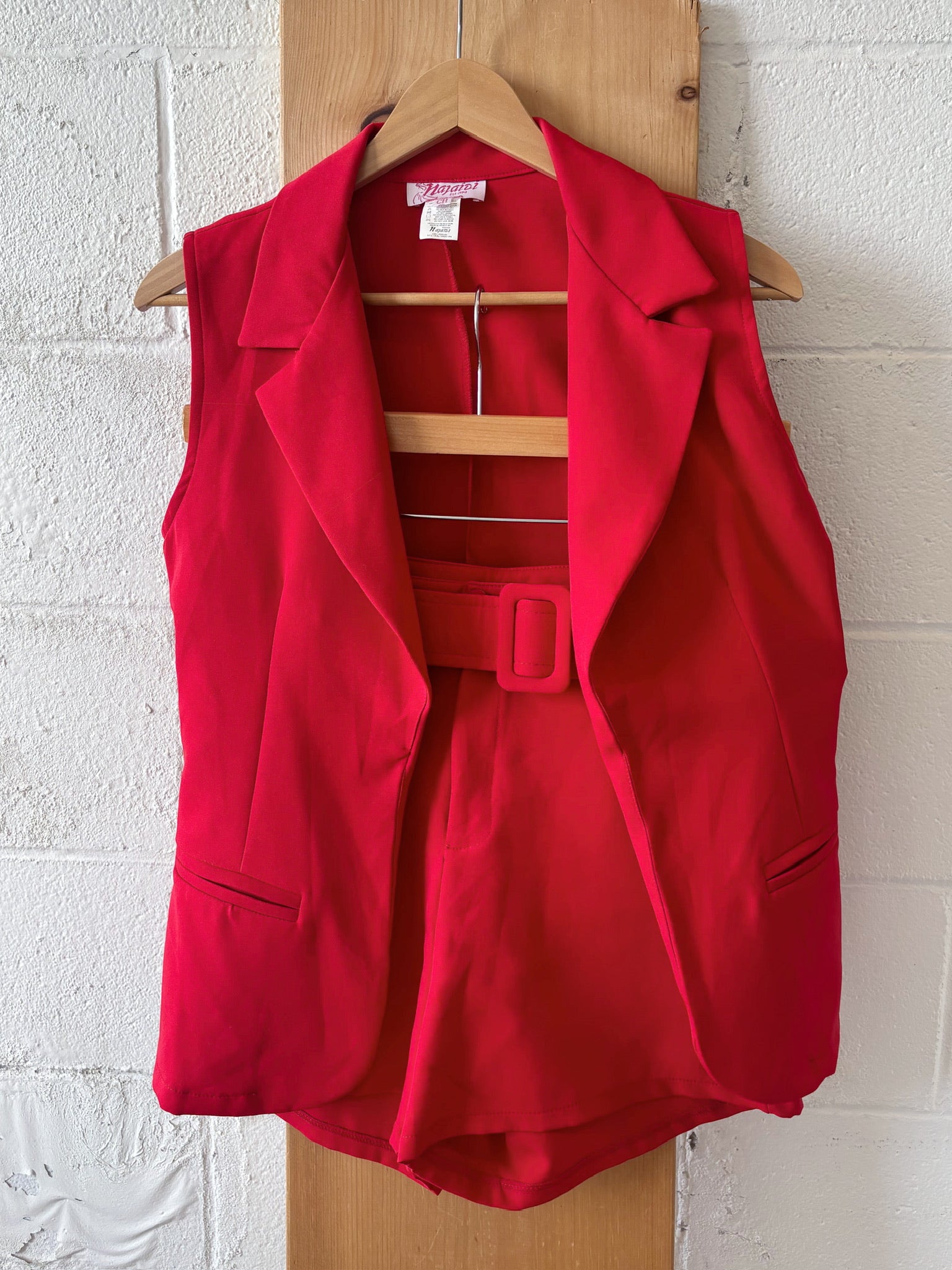 Tagged size small. Top: 16” P, 25” L. Shorts: 29” W, 16” L. Stain on belt.