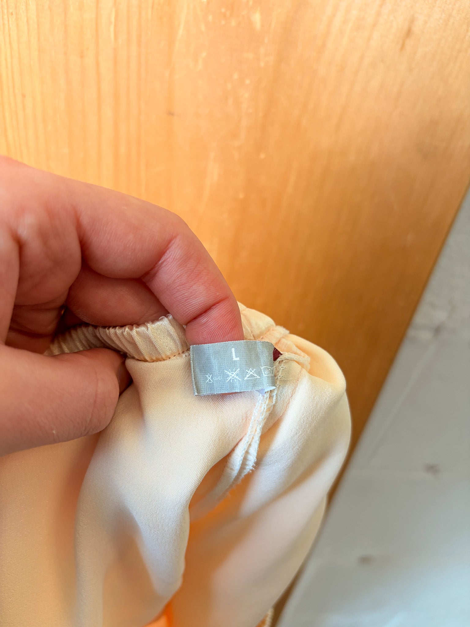 Tagged size L with an elastic waist, but fits closer to a S. 24"W, 14"inseam, 11.5"R