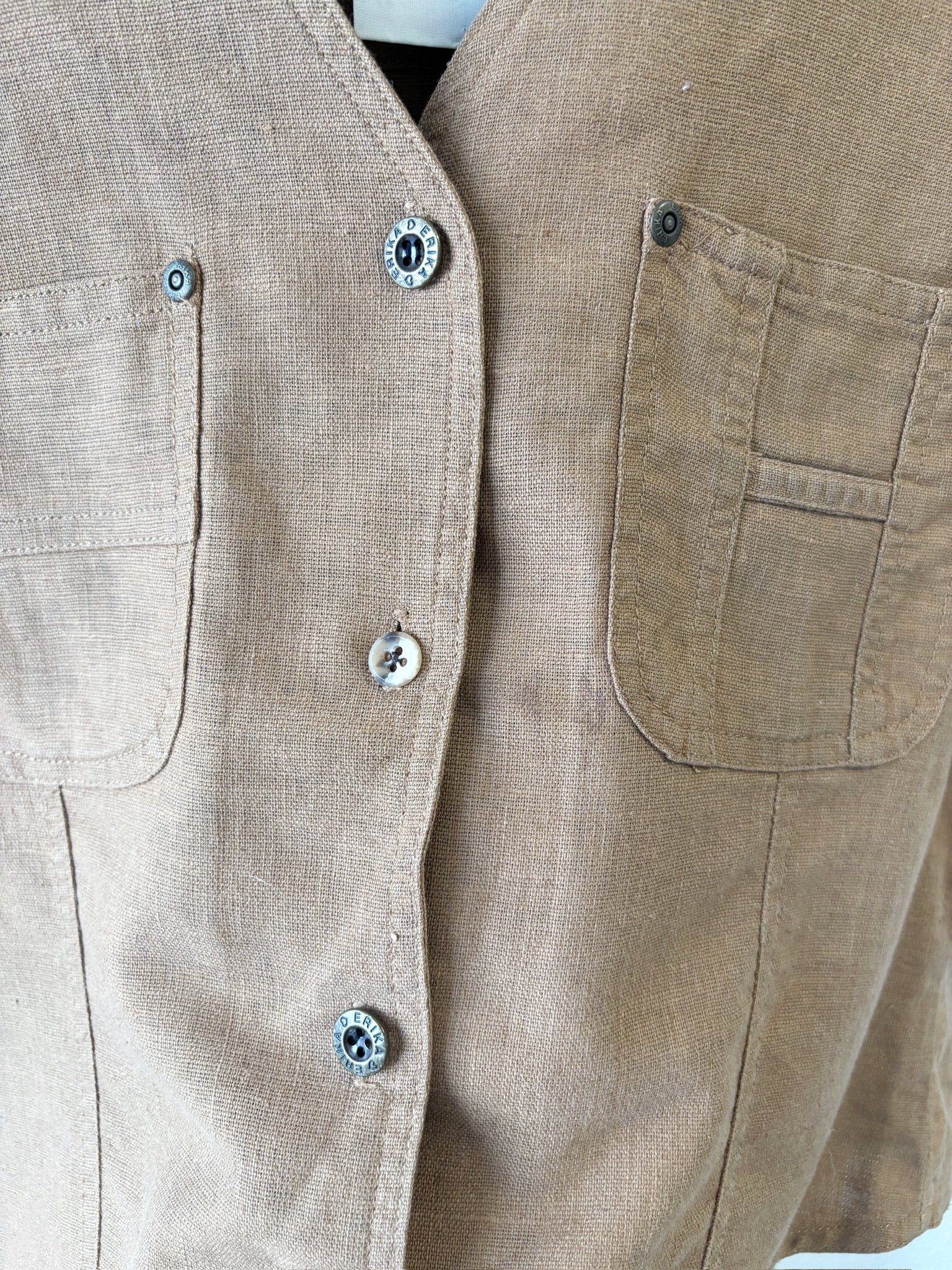 Size women’s medium. One button has been replaced, small stain. 20” P, 20”L