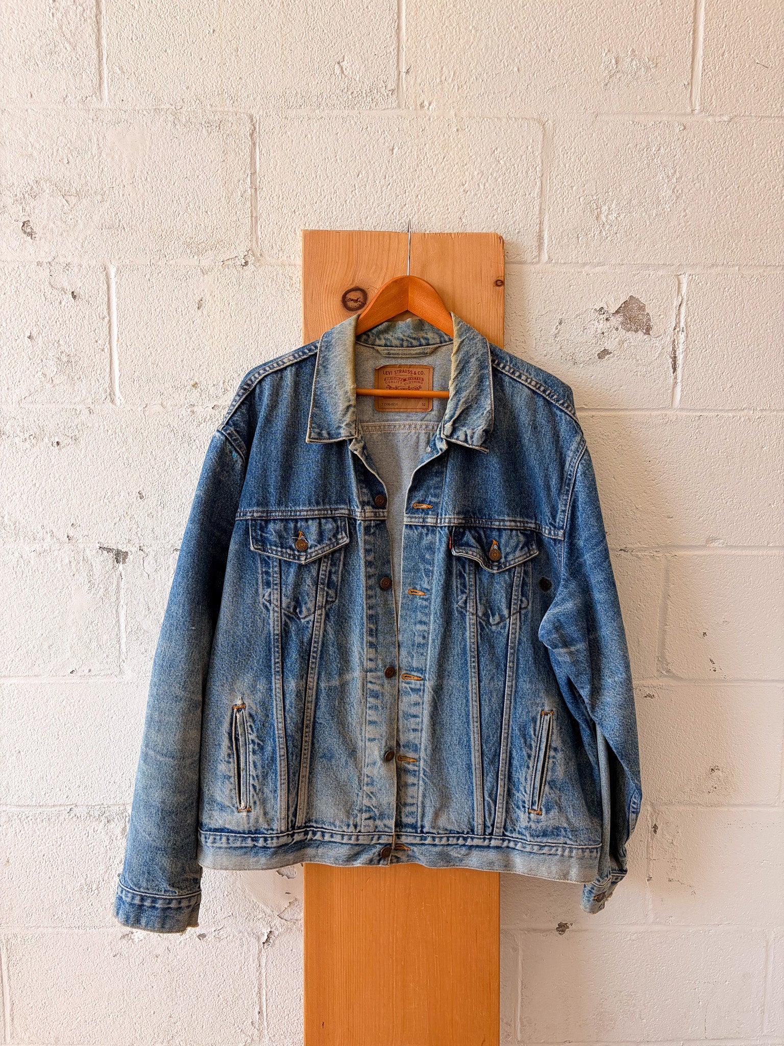 Tagged size 52, has some discoloration, fading, and distressing throughout, see photos. 26.5"P, 26"L, 27.5"S